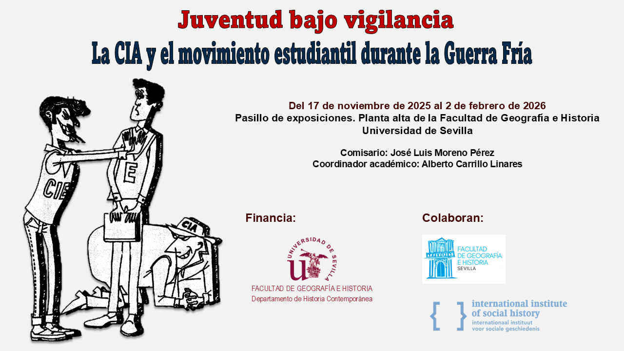 Juventud bajo vigilancia. La CIA y el movimiento estudiantil durante la Guerra Fría presenta los principales resultados de la investigación doctoral de José Luis Moreno Pérez, dirigida por el profesor Alberto Carrillo Linares en el Departamento de Historia Contemporánea. La tesis analiza por primera vez, de forma sistemática y exhaustiva, la actividad de la Conferencia Internacional de Estudiantes (CIE), una organización tapadera de la Central Intelligence Agency (CIA) que operó como plataforma de intervención política y cultural en el ámbito estudiantil y universitario, en el marco un de la Guerra Fría Cultural. La exposición ha sido financiada por el Departamento de Historia Contemporánea y cuenta con la colaboración de la Facultad de Geografía e Historia de la Universidad de Sevilla y del International Institute of Social History (IISH) de Ámsterdam.